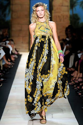Davidelfin, Spring 2010Flowing drapery, check; floral print, check; flowers in the hair, check, golden glow, check. All we're missing is a few cherubs and a green god standing in for a wind machine to get a whole Renaissance Faire. But whatever the inspiration DVF's collection is full of teh pretty (more about this Season's sudden explosion of pretty later) and I like it, even though I'd look like a jackass if I tried to wear it. Alas, my flowers-in-the-hair days are long over.